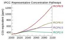 Les scénarios RCP (pour « Representative Concentration Pathway » en anglais, « Trajectoires représentatives de concentration » en français) sont quatre scénarios de trajectoire du forçage radiatif jusqu'à l'horizon 2100[1]. Ces scénarios ont été établis par le Groupe d'experts intergouvernemental sur l'évolution du climat (GIEC ou IPCC en anglais pour « Intergovernmental Panel on Climate Change ») pour son cinquième rapport, AR5 (IPCC Fifth Assessment Report ou Cinquième rapport d'évaluation du GIEC)[2].