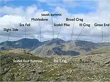 Scafell Pike, au sens strict, s'étend de l'arête de Mickledore au sud-ouest jusqu'au col de Broad Crag, vers 920 mètres d'altitude, au nord-est. Une définition un peu plus large, retenue par la plupart des guides, inclut les sommets de Broad Crag (934 m) et d'Ill Crag (935 m), ces derniers étant séparés par le col d'Ill Crag[2],[4]. Au nord d'Ill Crag se trouve la dépression de Calf Cove, à 850 mètres d'altitude, avant que l'arête ne s'élève de nouveau au Great End. Des sommets secondaires se trouvent de part et d'autre de Scafell Pike : le Lingmell, avec 807 mètres d'altitude, au nord-ouest, est généralement considéré comme un fell distinct[2],[4], alors que le Pen, un sommet bien détaché culminant à 760 mètres d'altitude au-dessus du fleuve Esk au sud-est, est souvent vu comme une antécime de Scafell Pike. Les Middleboot Knotts sont une élévation sur le versant septentrional de Broad Crag recensée en tant que nutall.