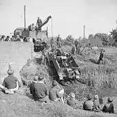 Un véhicule d'assistance Scammell Pioneer traine un char Crusader en panne en Tunisie en 1943.