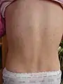 - un exanthème scarlatiniforme, coloration rouge diffuse de la peau, recouverte d'un fin granité, qui débute souvent et prédomine au niveau des plis de flexion (genoux, coudes, hanches), puis s'étend au thorax et à la racine des membres, puis gagne progressivement l'ensemble du revêtement cutané sans intervalle de peau saine, à l'exception des paumes et des plantes ; l'éruption est maximale en 2-3 jours, et disparaît en 6 jours. Elle est suivie par une desquamation entre le 7e et le 15e jour qui se fait dans le même sens que l'éruption ;