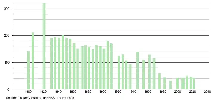 L'évolution du nombre d'habitants est connue à travers les recensements de la population effectués dans la commune depuis 1800. Pour les communes de moins de 10 000 habitants, une enquête de recensement portant sur toute la population est réalisée tous les cinq ans, les populations légales des années intermédiaires étant quant à elles estimées par interpolation ou extrapolation[26]. Pour la commune, le premier recensement exhaustif entrant dans le cadre du nouveau dispositif a été réalisé en 2007[27].