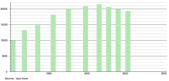 - Par convention dans Wikipédia, le principe a été retenu de n’afficher dans le tableau des recensements et le graphique, pour les populations légales postérieures à 1999, que les populations correspondant à une enquête exhaustive de recensement pour les communes de moins de 10 000 habitants, et que les populations des années 2006, 2011, 2016, etc. pour les communes de plus de 10 000 habitants, ainsi que la dernière population légale publiée par l’Insee pour l'ensemble des communes.