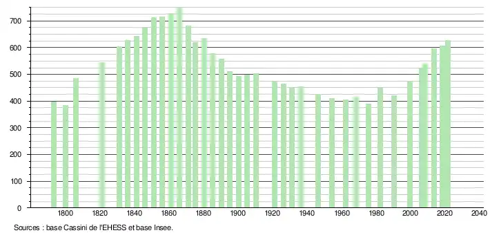 L'évolution du nombre d'habitants est connue à travers les recensements de la population effectués dans la commune depuis 1793. Pour les communes de moins de 10 000 habitants, une enquête de recensement portant sur toute la population est réalisée tous les cinq ans, les populations légales des années intermédiaires étant quant à elles estimées par interpolation ou extrapolation[21]. Pour la commune, le premier recensement exhaustif entrant dans le cadre du nouveau dispositif a été réalisé en 2008[22].