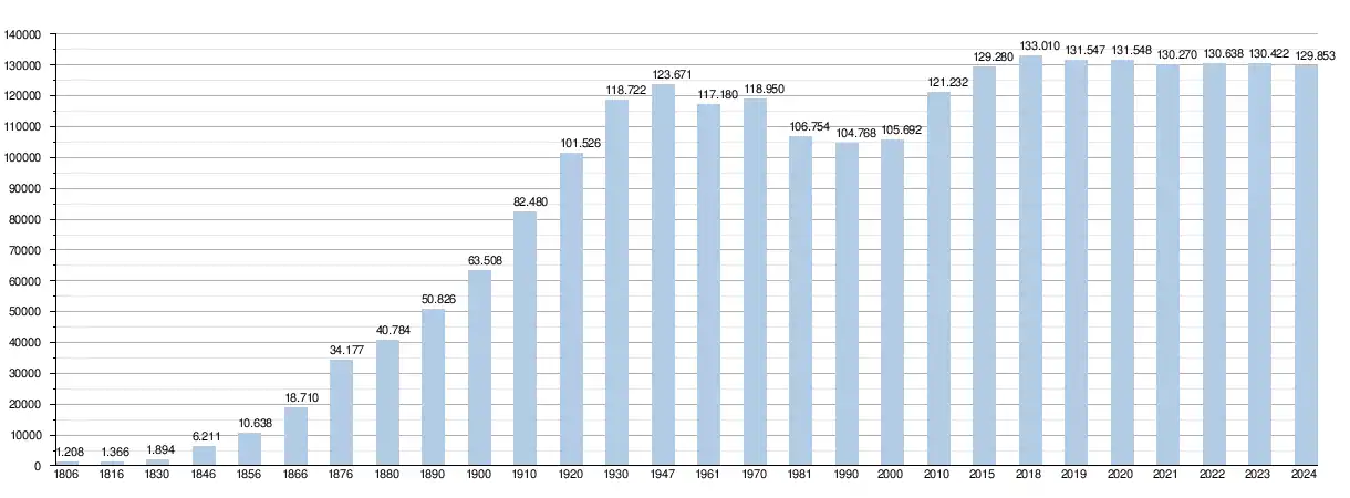 | Habitants | 1 894 | 6 211 | 10 638 | 18 710 | 34 177 | 40 784 | 50 826 | 63 508 | 82 480 | 101 526 | 118 722 | 123 671 | 117 180 | 118 950 | |||||||||||||||