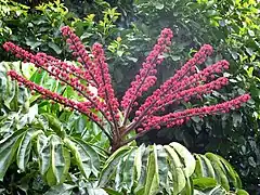 Schefflera actinophylla est un arbre pouvant atteindre 15 m de haut. Il est souvent à tronc multiples.