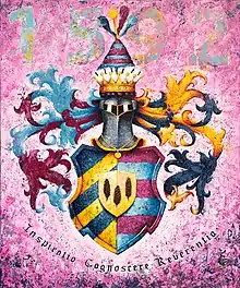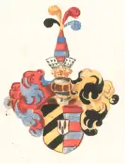 | Blasonnement | Champ mi-parti, en 1 fascé d’azur et de gueule de 6 pièces, en 2 bandé d’or et de sable de 6 pièces. Ornement extérieurs : Ecu timbré d’un heaume à cimier avec chapeau à plumage d’autruche penchant à dextre et à senestre et orné de lambrequins or. | |