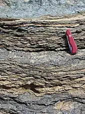 Le schiste métamorphique provient d'une argile qui sous l'action de la pression et de la température présente un feuilletage régulier en plans parallèles : la « schistosité ». Le plan de schistosité est oblique à la direction d'aplatissement (la stratification). Deux épisodes de déformation de directions différentes conduisent à la formation de deux directions de schistosité différentes, et à la création de « frites » (morceaux de roche allongés, de section assez petite, typiquement 1 cm ou moins).