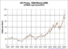 | NYMEX Cours du light-sweet crude en US dollars, de 2005 à (non ajusté de l'inflation) | 2005 à nov. 2008 |