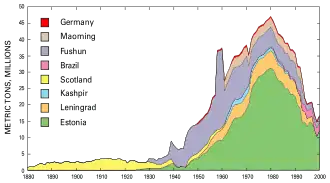 L'exploitation minière industrielle du schiste bitumineux débute à Autun, en France, puis s'étend à l'Écosse, l'Allemagne et à d'autres pays[1],[22]. Au XIXe siècle, les exploitations se concentrent sur la production de kérosène, d'huile et de gaz d'éclairage, et de paraffine ; en 1870, à Paris, un gaz manufacturé, appelé « gaz portatif comprimé » est obtenu à partir de boghead,un schiste bitumineux provenant d’Écosse, rendu transportable par compression ou liquéfaction[23] ; ces produits permettent de répondre à la demande croissante d'éclairage durant la révolution industrielle. On produit aussi du fioul, de l'huile et des graisses de lubrification et du sulfate d'ammonium[24]. L'industrie du schiste bitumineux se développe juste avant la Seconde Guerre mondiale en raison de l'accès limité aux ressources de pétrole conventionnel et à la production en masse d'automobiles et de camions, qui s'accompagne d'un accroissement de la consommation d'essence.