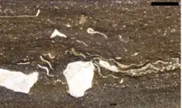 - Ces résidus sont probablement des restes fossilisés d'échinodermes, de brachiopodes et de trilobites[61].