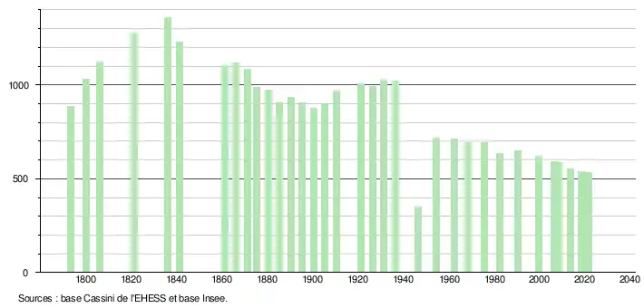 L'évolution du nombre d'habitants est connue à travers les recensements de la population effectués dans la commune depuis 1793. Pour les communes de moins de 10 000 habitants, une enquête de recensement portant sur toute la population est réalisée tous les cinq ans, les populations légales des années intermédiaires étant quant à elles estimées par interpolation ou extrapolation[22]. Pour la commune, le premier recensement exhaustif entrant dans le cadre du nouveau dispositif a été réalisé en 2008[23].