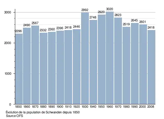 Le graphique suivant résume l'évolution de la population de Schwanden entre 1850 et 2008[4] :