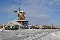 - moulin à galerie (stellingmolen) avec grange de sciage, la galerie (stelling) permet ici d'atteindre le moulin et les ailes du moulin.