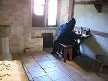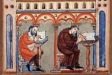 Un scriptorium était, en tout cas, une annexe nécessaire à une bibliothèque et une pièce de fabrication collective supervisée par un maître d'atelier (pouvant être l'armarius[7], le sacristain ou le chantre) dans les grands monastères. Dans le sens conventionnel d'une pièce spécifique, les scriptoria n'existaient probablement que pour des périodes de temps limitées, lorsqu'une institution ou un particulier souhaitaient qu'un grand nombre de textes soit copié afin de remplir une bibliothèque ; une fois celle-ci remplie, il n'y avait plus besoin d'une pièce réservée. Au début du XIIIe siècle, des boutiques de copie séculières se développèrent ; les scribes professionnels ont pu avoir des pièces spéciales pour écrire, mais, dans la plupart des cas, ils disposaient sans doute simplement d'un bureau près d'une fenêtre dans leur propre maison.