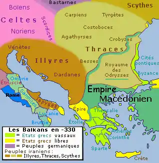 Le roi scythe le plus important du IVe siècle av. J.-C. est Ateas dont le long règne commence vers 400. À cette époque, les tribus scythes sont déjà installées de manière permanente sur les terres au sud du Danube, où vivent les sujets d'Ateas avec leurs familles et leur bétail. Ateas unifie les tribus scythes pour former un État rudimentaire et règne sur les territoires traditionnels du royaume scythe de la steppe pontique, au moins jusqu'en Crimée. Vers 350 av. J.-C., il s'empare de territoires au sud du Danube aux dépens des Gètes. Sous son règne, les cités grecques au sud du Danube sont également tombées sous son hégémonie, dont Kallatis où il émet probablement ses pièces de monnaie. Les Scythes contrôlent une grande partie de la rive droite du Danube comme l'attestent ses campagnes contre les Triballes et les Gètes et ses menaces contre Byzance. Il se rapproche un temps du roi de Macédoine Philippe II dans sa campagne contre la cité grecque d'Histria en Thrace ; mais étant parvenu à vaincre seul les Histriens, il repousse cette alliance et une guerre éclate entre avec les Macédoniens en 340-339. Ateas trouve la mort à l'âge de 90 ans et son armée est mise en déroute dans une bataille livrée le long du Danube. Les Macédoniens capturent le camp des Scythes et mettent la main sur 20 000 femmes et enfants et plus de 2 000 chevaux[83]'[80]. La défaite des Scythes semblent avoir entraîné la perte de territoires des deux côtés du Danube. Les Gètes se déplacent alors vers le nord à travers le Danube et s'installant dans les terres situées entre le Dniepr et le Prout. Ces changements n'affectent pas la puissance scythe : les Scythes continuent toujours à nomadiser et à enterrer leurs morts dans de riches kourganes dans les zones situées au nord-ouest de la mer Noire ; la capitale scythe de Kamianka continue d'être prospère même après la mort d'Ateas. En 331, Zopyrion, le stratège d'Alexandre le Grand en Thrace, mène une armée de 30 000 hommes dans une campagne contre les cités grecques du Pont-Euxin qui sont en bonnes relations avec les Scythes et échappent à l'hégémonie macédonienne. Zopyrion se dirige vers Olbia qu’il assiège. Mais les Scythes et les Milésiens la ravitaillent et Zopyrion se retrouve à son tour encerclé par les Gètes et les Scythes, qui anéantissent l'armée macédonienne. Zopyrion trouve la mort dans la bataille[80]. En 329, Alexandre entend faire une démonstration de puissance envers les Sakas et traverse avec son armée le Syr-Daria, contraignant les Sakas à fuir dans la steppe. Par la suite, une ambassade permet de conclure un pacte de non-agression[84].