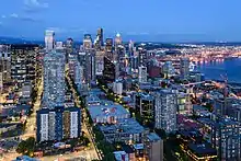D’autres entreprises de haute technologie se sont installées dans la banlieue de Seattle comme Microsoft, Google, Amazon, RealNetworks, McCaw Cellular (maintenant AT&T Wireless), VoiceStream (maintenant T-Mobile), Philips, Boston Scientific, ZymoGenetics et Amgen. Ces firmes attirèrent énormément de travailleurs et la population augmenta de 50 000 personnes entre 1990 et 2000 selon le recensement américain de 2000[46] tout en développant la construction de bureaux dans la ville[47] comme dans les autres grandes villes américaines que sont San Francisco, New York, Los Angeles et Boston. Ces compagnies restent puissantes mais le boom s’est arrêté au début de l’année 2001 après un pic du NASDAQ en [48],[49].