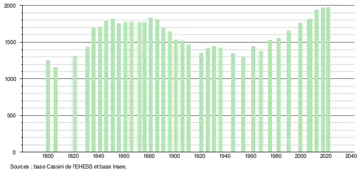 L'évolution du nombre d'habitants est connue à travers les recensements de la population effectués dans la commune depuis 1800. Pour les communes de moins de 10 000 habitants, une enquête de recensement portant sur toute la population est réalisée tous les cinq ans, les populations légales des années intermédiaires étant quant à elles estimées par interpolation ou extrapolation[22]. Pour la commune, le premier recensement exhaustif entrant dans le cadre du nouveau dispositif a été réalisé en 2007[23].