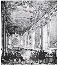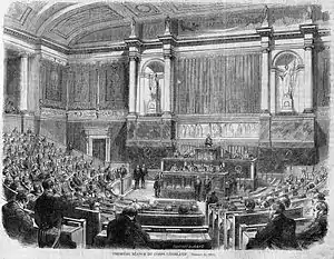 Les élections du 31 mai 1863 interviennent dans un contexte marqué par des difficultés économiques liées aux mauvaises récoltes, à leurs effets désastreux sur l'industrie textile, en raison de la pénurie de coton, du blocus des côtes sudistes par les troupes de Lincoln, provoquant faillites et montée du chômage[43]. Plus de 300 candidats d'opposition se présentent, les plus nombreux étant les républicains alors même que, depuis 1858, le serment de fidélité à la Constitution est exigé de tous les candidats et non plus seulement de ceux qui sont élus. Des alliances sont contractées entre monarchistes et républicains, notamment à Paris où l'orléaniste mais néanmoins empreint d'idées républicaines Adolphe Thiers se présente sur une liste unique comprenant une majorité de candidats républicains[44]. Finalement, avec 5 308 000 suffrages, les candidats gouvernementaux perdent des suffrages tandis que l'opposition obtient 1 954 000 votes et 32 sièges (17 républicains et 15 indépendants dont Thiers) alors que le taux d'abstention recule fortement (27 %). Si par leur vote, les campagnes et les villes inférieures à 40 000 habitants ont soutenu les candidats officiels, les suffrages des grandes villes sont allés majoritairement à l'opposition[45]. Néanmoins, de grandes personnalités de l'opposition tels Charles de Rémusat ou le Comte de Montalembert subissent un échec dans leur tentative de retrouver les bancs de l'Assemblée.