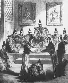 Le décret du 24 novembre 1860, complété par les sénatus-consultes des 2 et 3 février et du 31 décembre 1861, réforme la constitution de 1852. Il s'agit pour Napoléon III de donner aux grands corps de l'État une participation plus directe à la politique générale du gouvernement[39]. Ainsi, le droit d'adresse du Sénat et du Corps législatif est rétabli, le droit d'amendement est élargi ainsi que les modalités de discussion des projets de loi. Un compte-rendu sténographique des débats est instauré et rendu public. L'empereur compte sur cette mesure pour tenir en échec l'opposition catholique montante, qui est de plus en plus alarmée par la politique de laissez-faire pratiquée par l'Empereur en Italie. Les modalités de discussion budgétaire sont elles aussi modifiées, le budget cessant d'être voté globalement par département ministériel, permettant à l'assemblée d'exercer un contrôle vigilant et rigoureux sur l'administration et la politique du gouvernement. Le fonctionnement de l'État tend alors à se rapprocher de celui d'une monarchie constitutionnelle[40]. Le Second Empire est alors à son apogée[41]. Pour Lord Newton, « Si la carrière de Napoléon III s'était terminée en 1862, il aurait probablement laissé un grand nom dans l'Histoire et le souvenir de brillants succès »[42].