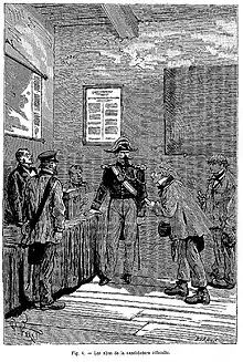Durant le coup d'État du 2 décembre 1851, des policiers et des soldats recherchent des armes chez des particuliers.