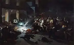 L'attentat de Felice Orsini contre Napoléon III devant la façade de l'Opéra, le , par H. Vittori Romano (1862).