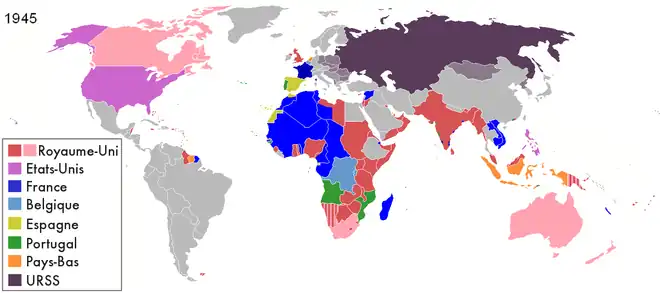 La Seconde Guerre mondiale propulse les États-Unis et l'URSS, principaux vainqueurs, au rang de superpuissances concurrentes appelées à dominer le monde et à se confronter dans une vive rivalité idéologique et politique, pendant près d'un demi-siècle, et à s'affronter militairement par États interposés comme pour la guerre de Corée, celle du Viêt Nam et celle d'Afghanistan. Elle scelle le déclin des vieilles puissances impériales d'Europe et ouvre le processus de décolonisation qui s'accélère dans l'après-guerre en Asie, dans le monde arabe et en Afrique, jusqu'aux années 1960.