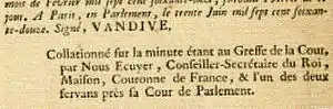 Ainsi, les secrétaires du roi et leurs descendants jouissent de la noblesse immédiate et immédiatement transmissible lors de leur entrée en charge, "tant & si longtemps que [l'officier] sera revêtu de la charge de Secrétaire du roi, & s'il décède en la fonction d'icelle, ou obtient lettre de vétérance"[10]. En effet, en cas de démission ou de vente de la charge avant d'avoir effectué vingt années d'exercice, leur noblesse s'évanouissait[11]. En cas de suppression par l'autorité souveraine, le roi statuait au cas par cas, souvent de façon favorable, mais en assortissant la maintenue de conditions supplémentaires (augmentation de finance).