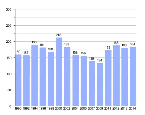 | 1990 | 1992 | 1994 | 1996 | 1998 | 2000 | 2002 | 2004 | 2005 | 2007 | 2009 | 2011 | 2012 | 2013 | 2014 | |||||
