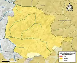 Le retrait-gonflement des sols argileux est susceptible d'engendrer des dommages importants aux bâtiments en cas d’alternance de périodes de sécheresse et de pluie. 96,8 % de la superficie communale est en aléa moyen ou fort (26,8 % au niveau départemental et 48,5 % au niveau national). Sur les 160 bâtiments dénombrés sur la commune en 2019, 153 sont en aléa moyen ou fort, soit 96 %, à comparer aux 36 % au niveau départemental et 54 % au niveau national. Une cartographie de l'exposition du territoire national au retrait gonflement des sols argileux est disponible sur le site du BRGM[16],[Carte 2].