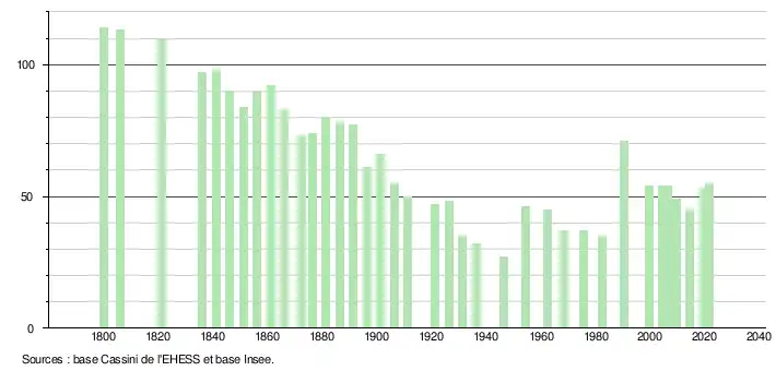 L'évolution du nombre d'habitants est connue à travers les recensements de la population effectués dans la commune depuis 1800. Pour les communes de moins de 10 000 habitants, une enquête de recensement portant sur toute la population est réalisée tous les cinq ans, les populations légales des années intermédiaires étant quant à elles estimées par interpolation ou extrapolation[13]. Pour la commune, le premier recensement exhaustif entrant dans le cadre du nouveau dispositif a été réalisé en 2004[14].