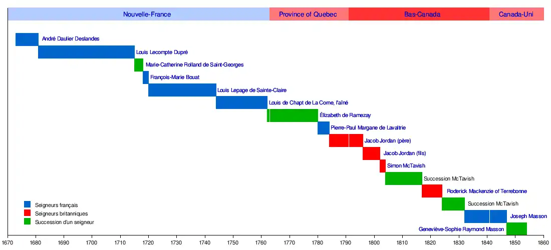 | 8e | ![]() | Pierre-Paul Margane de Lavaltrie, gendre de Louis de Chapt de La Corne 1766-1783 : Co-seigneur de Terrebonne (par sa femme Marie-Angélique de La Corne) avec les Douglas (enfants de Marie-Charlotte de La Corne) et avec François-Josué de La Corne (1750-1800). Il est le seul signataire des actes de concessions entre |
