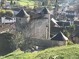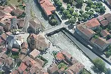 L'église (à gauche) et la mairie (à droite) vues depuis le pont du Haut-Salat. | |||||