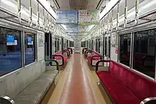 L'organisation des places assises est en longitudinal, une référence habituelle au Japon pour les lignes de banlieue. Des emplacements porte-bagages sont présents au dessus des sièges.