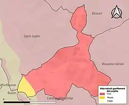 Le retrait-gonflement des sols argileux est susceptible d'engendrer des dommages importants aux bâtiments en cas d’alternance de périodes de sécheresse et de pluie. La totalité de la commune est en aléa moyen ou fort (94,5 % au niveau départemental et 48,5 % au niveau national). Sur les 38 bâtiments dénombrés sur la commune en 2019, 38 sont en aléa moyen ou fort, soit 100 %, à comparer aux 93 % au niveau départemental et 54 % au niveau national. Une cartographie de l'exposition du territoire national au retrait gonflement des sols argileux est disponible sur le site du BRGM[21],[Carte 3].