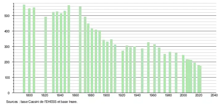 L'évolution du nombre d'habitants est connue à travers les recensements de la population effectués dans la commune depuis 1793. Pour les communes de moins de 10 000 habitants, une enquête de recensement portant sur toute la population est réalisée tous les cinq ans, les populations légales des années intermédiaires étant quant à elles estimées par interpolation ou extrapolation[19]. Pour la commune, le premier recensement exhaustif entrant dans le cadre du nouveau dispositif a été réalisé en 2004[20].