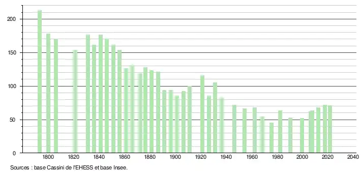 L'évolution du nombre d'habitants est connue à travers les recensements de la population effectués dans la commune depuis 1793. Pour les communes de moins de 10 000 habitants, une enquête de recensement portant sur toute la population est réalisée tous les cinq ans, les populations légales des années intermédiaires étant quant à elles estimées par interpolation ou extrapolation[19]. Pour la commune, le premier recensement exhaustif entrant dans le cadre du nouveau dispositif a été réalisé en 2007[20].
