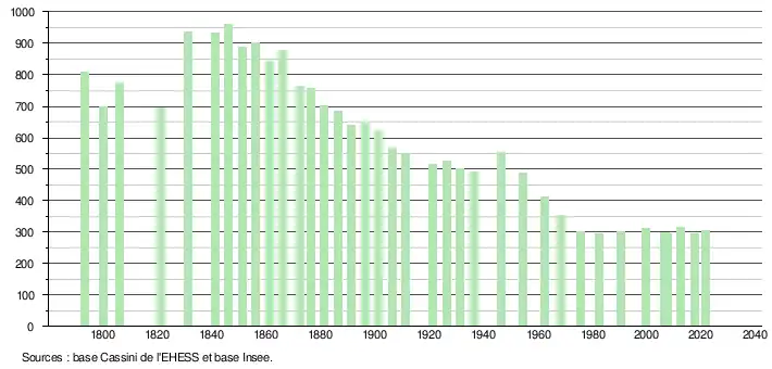 L'évolution du nombre d'habitants est connue à travers les recensements de la population effectués dans la commune depuis 1793. Pour les communes de moins de 10 000 habitants, une enquête de recensement portant sur toute la population est réalisée tous les cinq ans, les populations légales des années intermédiaires étant quant à elles estimées par interpolation ou extrapolation[26]. Pour la commune, le premier recensement exhaustif entrant dans le cadre du nouveau dispositif a été réalisé en 2007[27].
