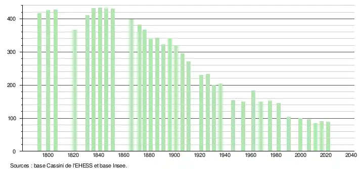 L'évolution du nombre d'habitants est connue à travers les recensements de la population effectués dans la commune depuis 1793. Pour les communes de moins de 10 000 habitants, une enquête de recensement portant sur toute la population est réalisée tous les cinq ans, les populations légales des années intermédiaires étant quant à elles estimées par interpolation ou extrapolation[19]. Pour la commune, le premier recensement exhaustif entrant dans le cadre du nouveau dispositif a été réalisé en 2006[20].