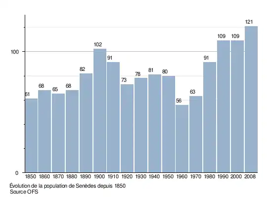 Selon l'Office fédéral de la statistique, Senèdes compte 150 habitants en 2022[4]. Sa densité de population atteint 300 hab./km2.