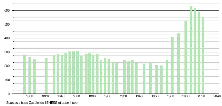 L'évolution du nombre d'habitants est connue à travers les recensements de la population effectués dans la commune depuis 1793. Pour les communes de moins de 10 000 habitants, une enquête de recensement portant sur toute la population est réalisée tous les cinq ans, les populations légales des années intermédiaires étant quant à elles estimées par interpolation ou extrapolation[22]. Pour la commune, le premier recensement exhaustif entrant dans le cadre du nouveau dispositif a été réalisé en 2006[23].
