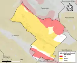 Le retrait-gonflement des sols argileux est susceptible d'engendrer des dommages importants aux bâtiments en cas d’alternance de périodes de sécheresse et de pluie. 87,5 % de la superficie communale est en aléa moyen ou fort (52,8 % au niveau départemental et 48,5 % au niveau national). Sur les 274 bâtiments dénombrés sur la commune en 2019, 242 sont en aléa moyen ou fort, soit 88 %, à comparer aux 70 % au niveau départemental et 54 % au niveau national. Une cartographie de l'exposition du territoire national au retrait gonflement des sols argileux est disponible sur le site du BRGM[18],[Carte 2].