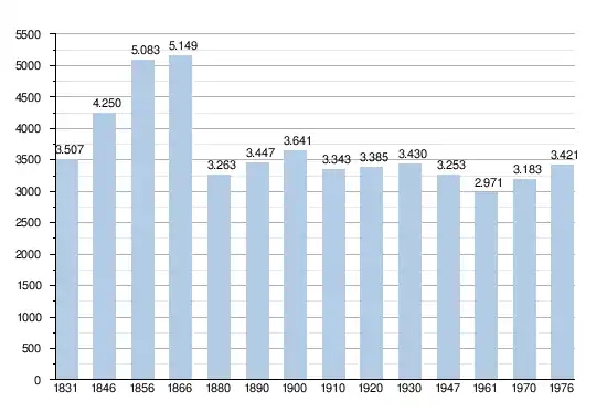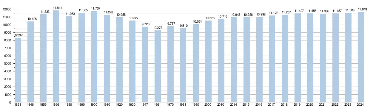 Les chiffres des années 1831 à 1970 tiennent compte des chiffres des anciennes communes fusionnées.