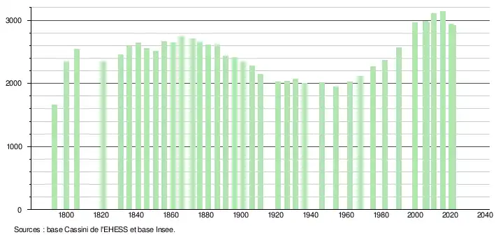 L'évolution du nombre d'habitants est connue à travers les recensements de la population effectués dans la commune depuis 1793. Pour les communes de moins de 10 000 habitants, une enquête de recensement portant sur toute la population est réalisée tous les cinq ans, les populations légales des années intermédiaires étant quant à elles estimées par interpolation ou extrapolation[34]. Pour la commune, le premier recensement exhaustif entrant dans le cadre du nouveau dispositif a été réalisé en 2005[35].