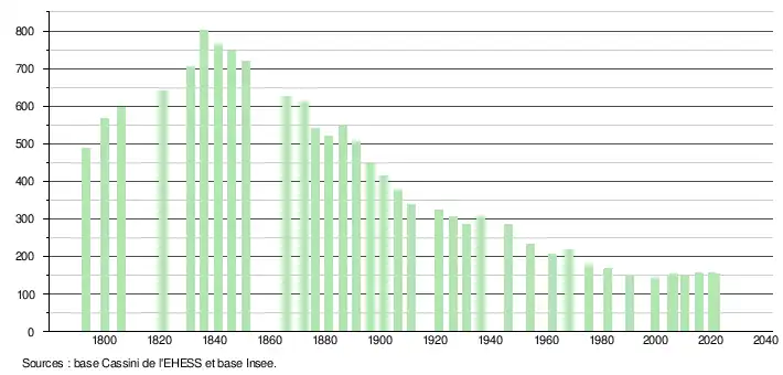 L'évolution du nombre d'habitants est connue à travers les recensements de la population effectués dans la commune depuis 1793. Pour les communes de moins de 10 000 habitants, une enquête de recensement portant sur toute la population est réalisée tous les cinq ans, les populations légales des années intermédiaires étant quant à elles estimées par interpolation ou extrapolation[17]. Pour la commune, le premier recensement exhaustif entrant dans le cadre du nouveau dispositif a été réalisé en 2005[18].