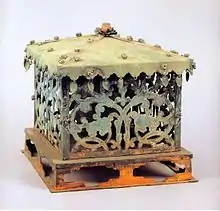 - un coffret en bronze doré décoré de fleurs de lotus renfermant des fioles à sarira, les cendres de maîtres spirituels du bouddhisme. Les urnes funéraires sont en or, en argent ou en bois.