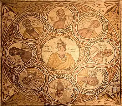 Platon fournit la plus ancienne liste des Sept sages qui nous est parvenue[6],[note 3], mais on en trouve d'autres et les listes ainsi que les attributions des sentences varient[note 4]. De toute façon, selon Démétrios de Phalère, la tradition serait bien plus ancienne. Les Sept sages étaient connus pour leur sagesse pratique et leurs sentences et maximes mémorables. Selon Dicéarque, élève d'Aristote, les Sept Sages ne sont ni philosophes, ni sages, mais de bons législateurs et des hommes perspicaces[9].