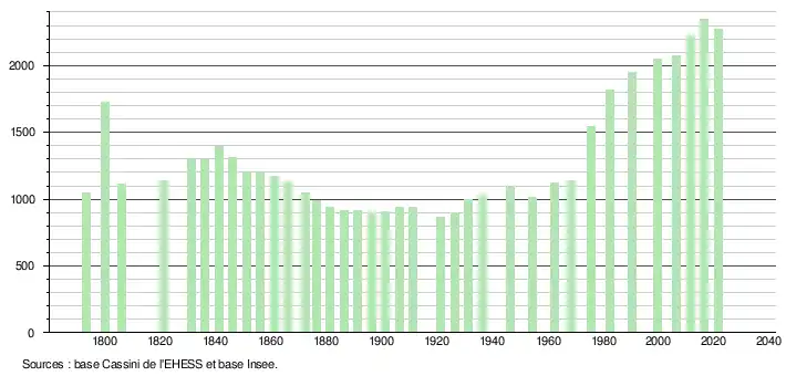 L'évolution du nombre d'habitants est connue à travers les recensements de la population effectués dans la commune depuis 1793. Pour les communes de moins de 10 000 habitants, une enquête de recensement portant sur toute la population est réalisée tous les cinq ans, les populations légales des années intermédiaires étant quant à elles estimées par interpolation ou extrapolation[28]. Pour la commune, le premier recensement exhaustif entrant dans le cadre du nouveau dispositif a été réalisé en 2006[29].