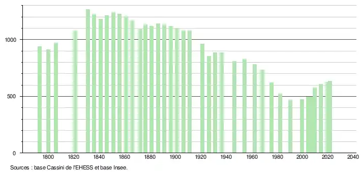 L'évolution du nombre d'habitants est connue à travers les recensements de la population effectués dans la commune depuis 1793. Pour les communes de moins de 10 000 habitants, une enquête de recensement portant sur toute la population est réalisée tous les cinq ans, les populations légales des années intermédiaires étant quant à elles estimées par interpolation ou extrapolation[23]. Pour la commune, le premier recensement exhaustif entrant dans le cadre du nouveau dispositif a été réalisé en 2004[24].