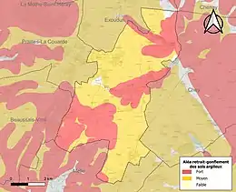 Les mouvements de terrains susceptibles de se produire sur la commune sont des tassements différentiels[18]. Le retrait-gonflement des sols argileux est susceptible d'engendrer des dommages importants aux bâtiments en cas d’alternance de périodes de sécheresse et de pluie[19]. 98,4 % de la superficie communale est en aléa moyen ou fort (54,9 % au niveau départemental et 48,5 % au niveau national)[Carte 2]. Depuis le , en application de la loi ELAN, différentes contraintes s'imposent aux vendeurs, maîtres d'ouvrages ou constructeurs de biens situés dans une zone classée en aléa moyen ou fort[Note 3],[20].