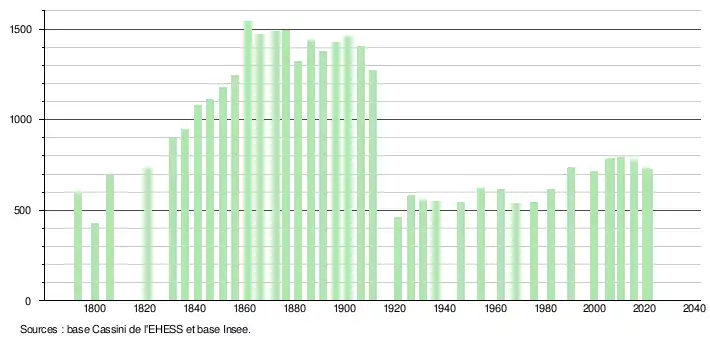 L'évolution du nombre d'habitants est connue à travers les recensements de la population effectués dans la commune depuis 1793. Pour les communes de moins de 10 000 habitants, une enquête de recensement portant sur toute la population est réalisée tous les cinq ans, les populations légales des années intermédiaires étant quant à elles estimées par interpolation ou extrapolation[22]. Pour la commune, le premier recensement exhaustif entrant dans le cadre du nouveau dispositif a été réalisé en 2005[23].